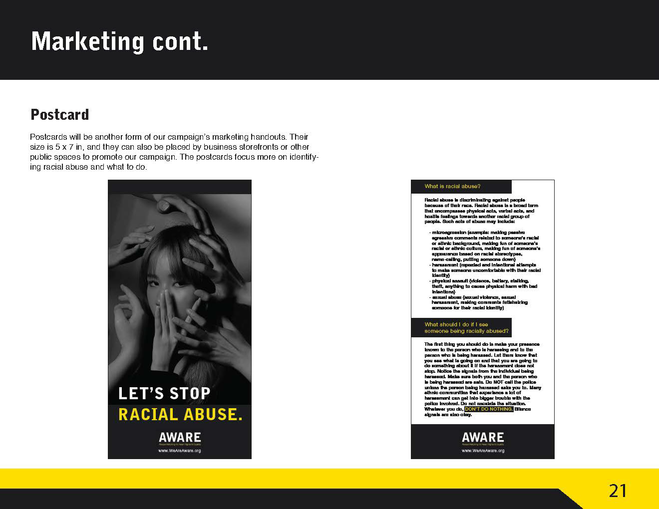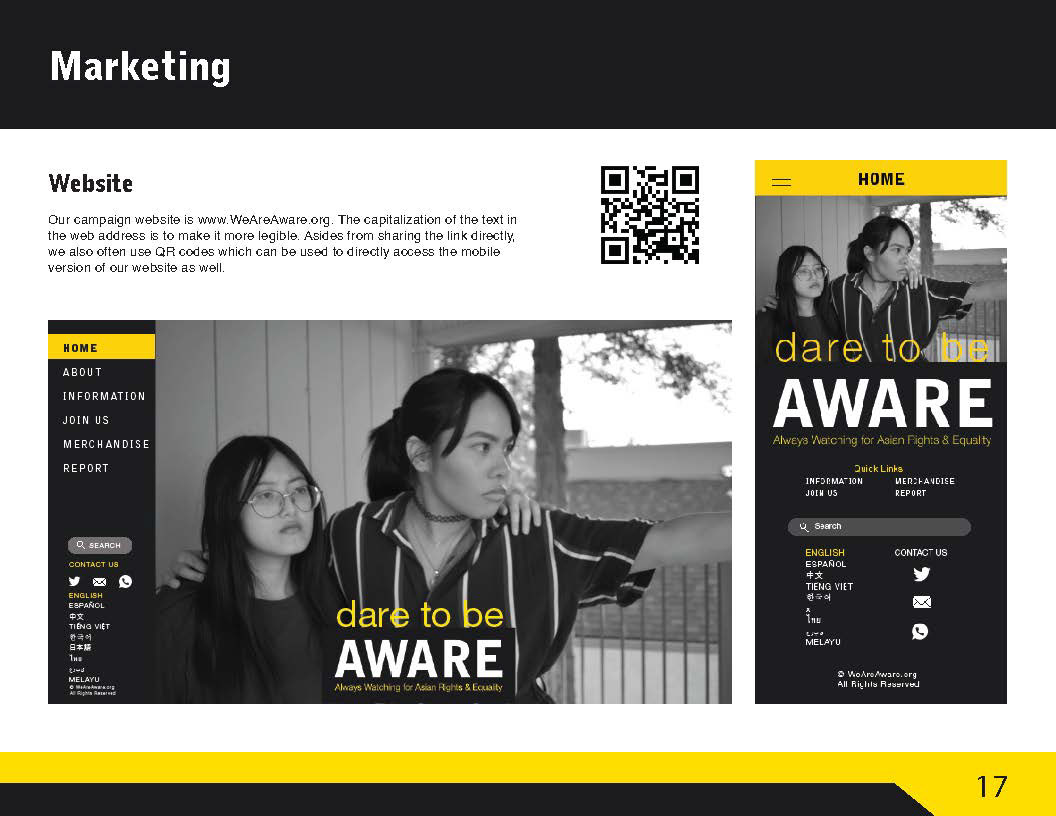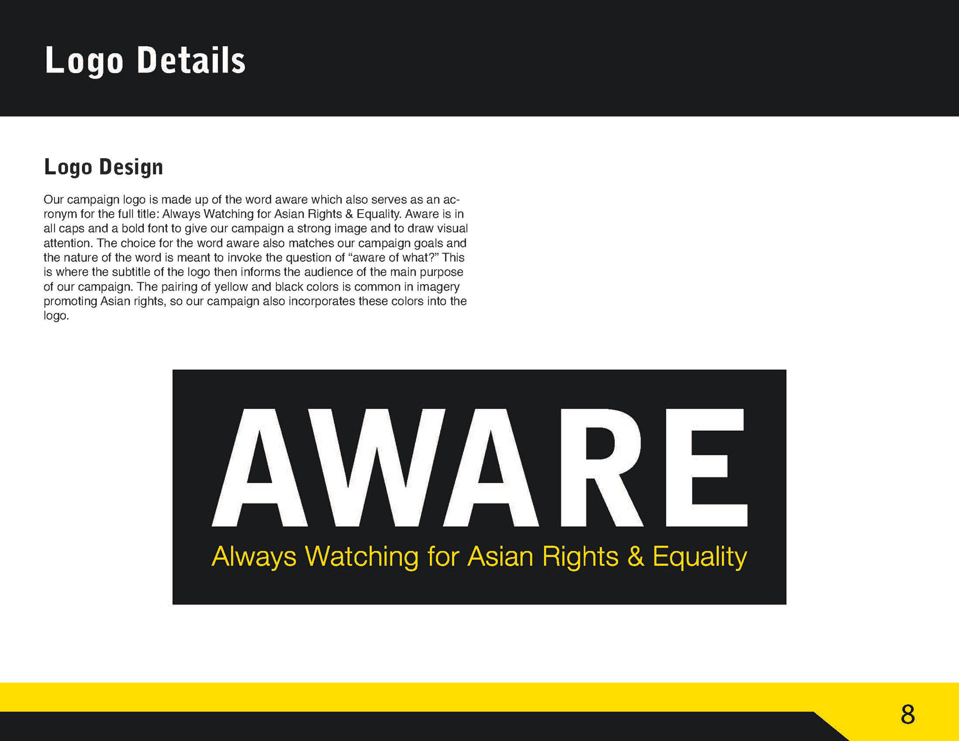 A.W.A.R.E.-- or Always Watching for Asian American Rights & Equality-- is a community-watch program targeting businesses in Sacramento, the city with one of the highest percentages of anti-Asian hate crimes and violence in 2020. In this project, I designed the website (both for mobile and desktop), merchandise, and the e-commerce store. I also took stock photography of my Asian-American roommates, Ariel Hilomen and Jane Tai; I came up with the name of the organization; and I developed the budget and timeline. I co-led my teammates, Jacky Kuo and Ulysses Tu, with William Chen, who designed the logo and campaign presentation, to design the marketing materials, such as the posters and social media.